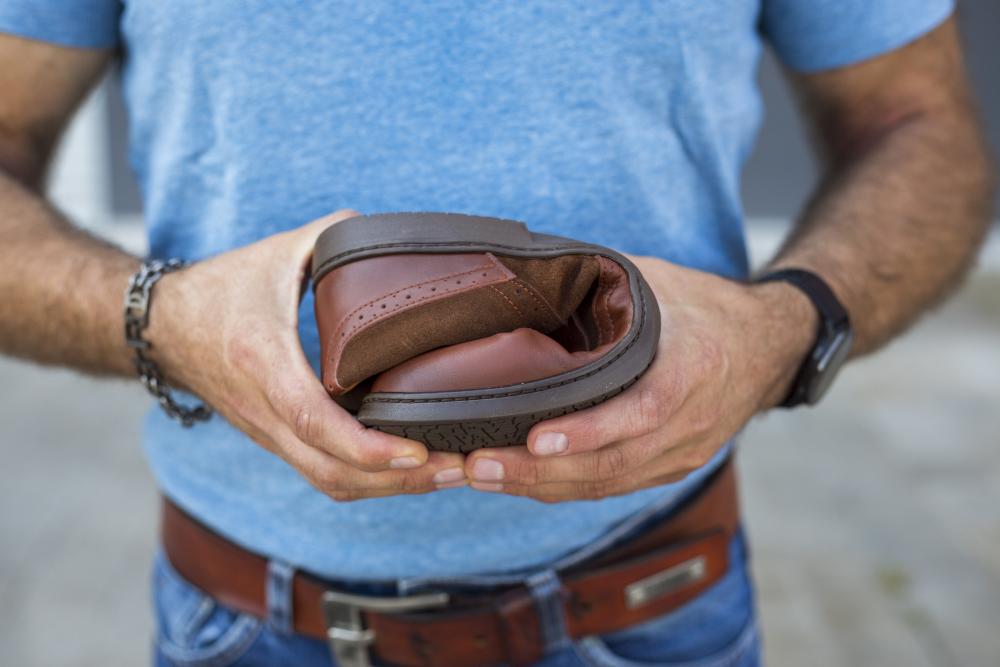 Kautschuksohle mit Nullabsatz, dadurch Entlastung der Wirbelsäule und Schonung der Gelenke, unterstützt die natürliche Körperhaltung