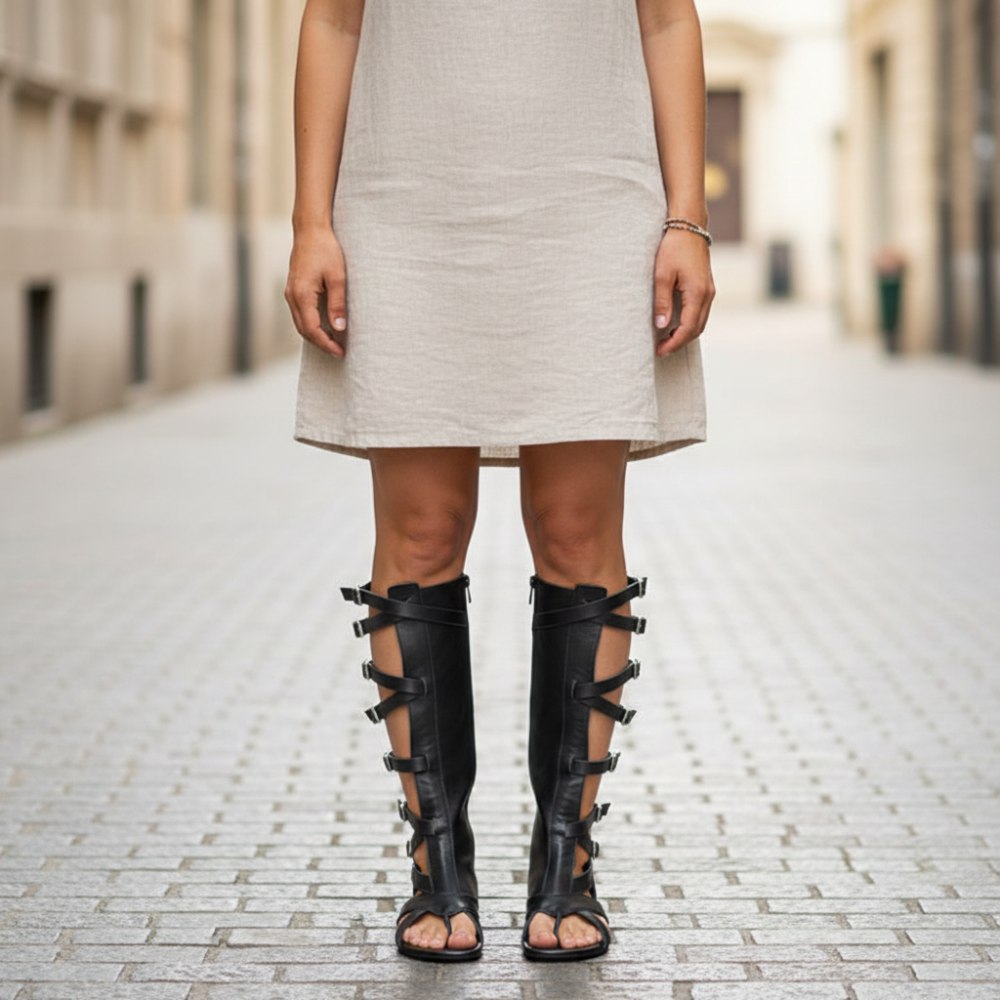 Der hohe Schaft ist auf einer Seite geschlossen und für den bequemen Einstieg mit einem Reißverschluss versehen. Die andere Seite ist offen und wird nur durch die vielen Riemchen gehalten. Diese lassen nicht nur besonders viel Luft an Deine Waden, sie dienen auch dazu, den Schaft perfekt auf Deine Größe anzupassen. Zu eng oder zu weit gibt es mit unserem DAMASQ nicht!