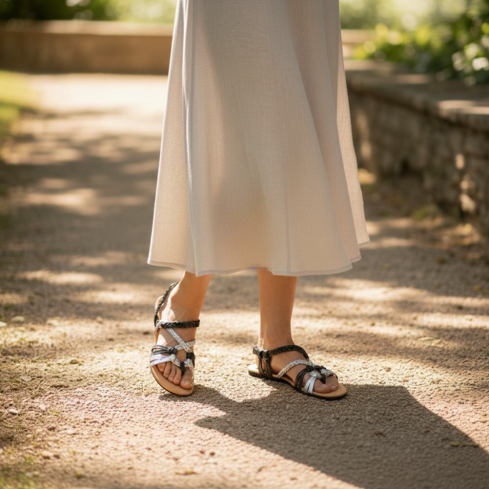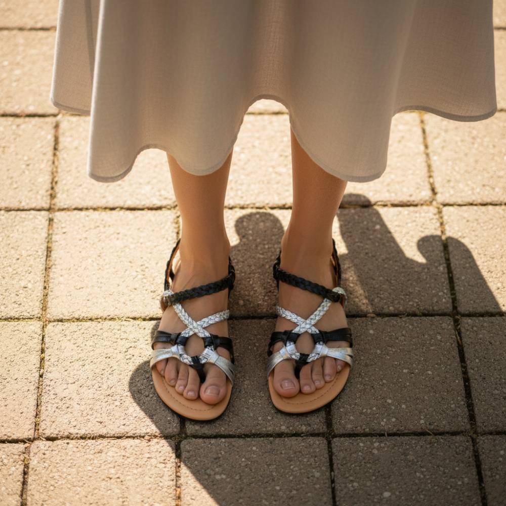 Die Riemchen in Schwarz und Silber verlaufen in ungewöhnlicher Form, mal geflochten, mal geknotet. Das macht den femininen Look der Barfußsandale aus. Und das Beste: Du musst nichts öffnen, um reinzuschlüpfen, denn am hinteren Riemchen haben wir ein Elastikband eingearbeitet. Einfacher kann man eine Sandale nicht an- und ausziehen.