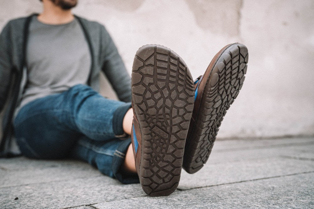 Der schicke Barfußschuh zum Schnüren besticht durch die natürliche und gleichzeitig moderne Farbkombination aus Braun und Blau. Auch der niedrige Schaft ist so geschnitten, sodass Deine Knöchel gut gestützt werden auf längeren Wegen und ein Umknicken verhindert wird.