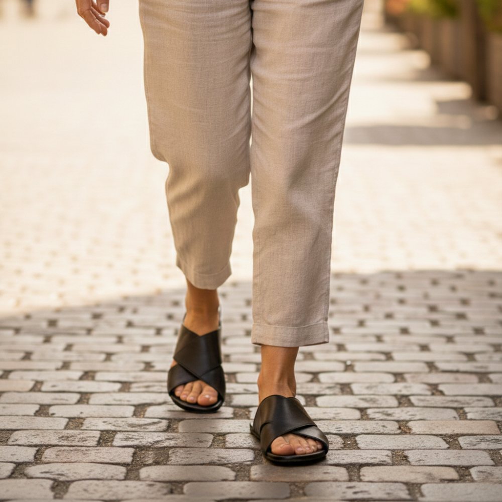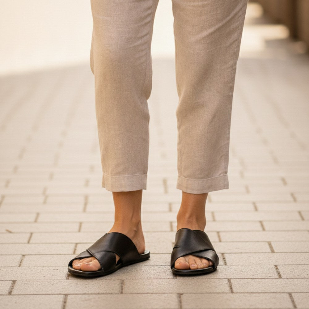 Mit zwei gekreuzten Lederriemen, die besten Halt bieten, kannst Du einfach in die MANQA Black Sandalen hineinschlüpfen und Deinen Tag in vollen Zügen genießen. Keine Schnallen, kein Schnickschnack – einfach nur purer Komfort und Freiheit für Deine Füße. Diese Sandalen vereinen die Leichtigkeit eines Barfußschuhs mit der Eleganz eines modischen Accessoires.