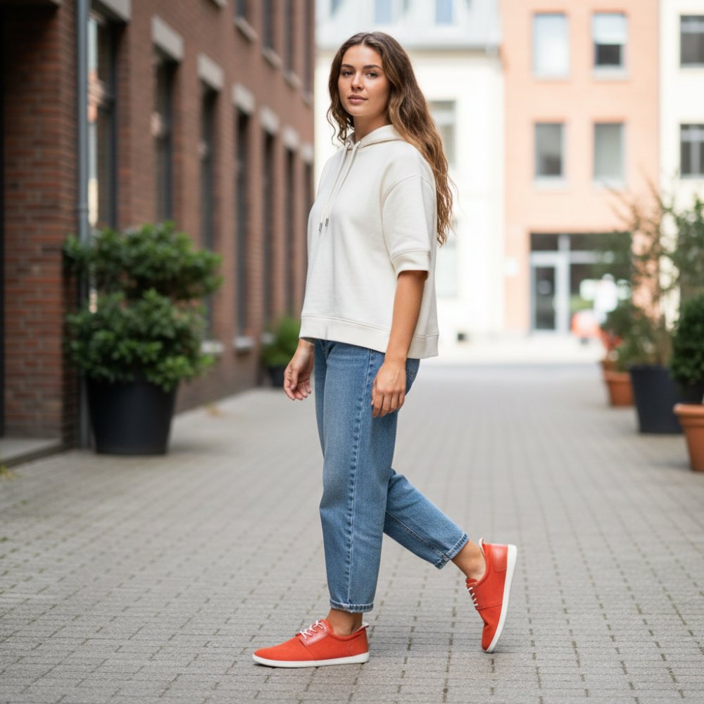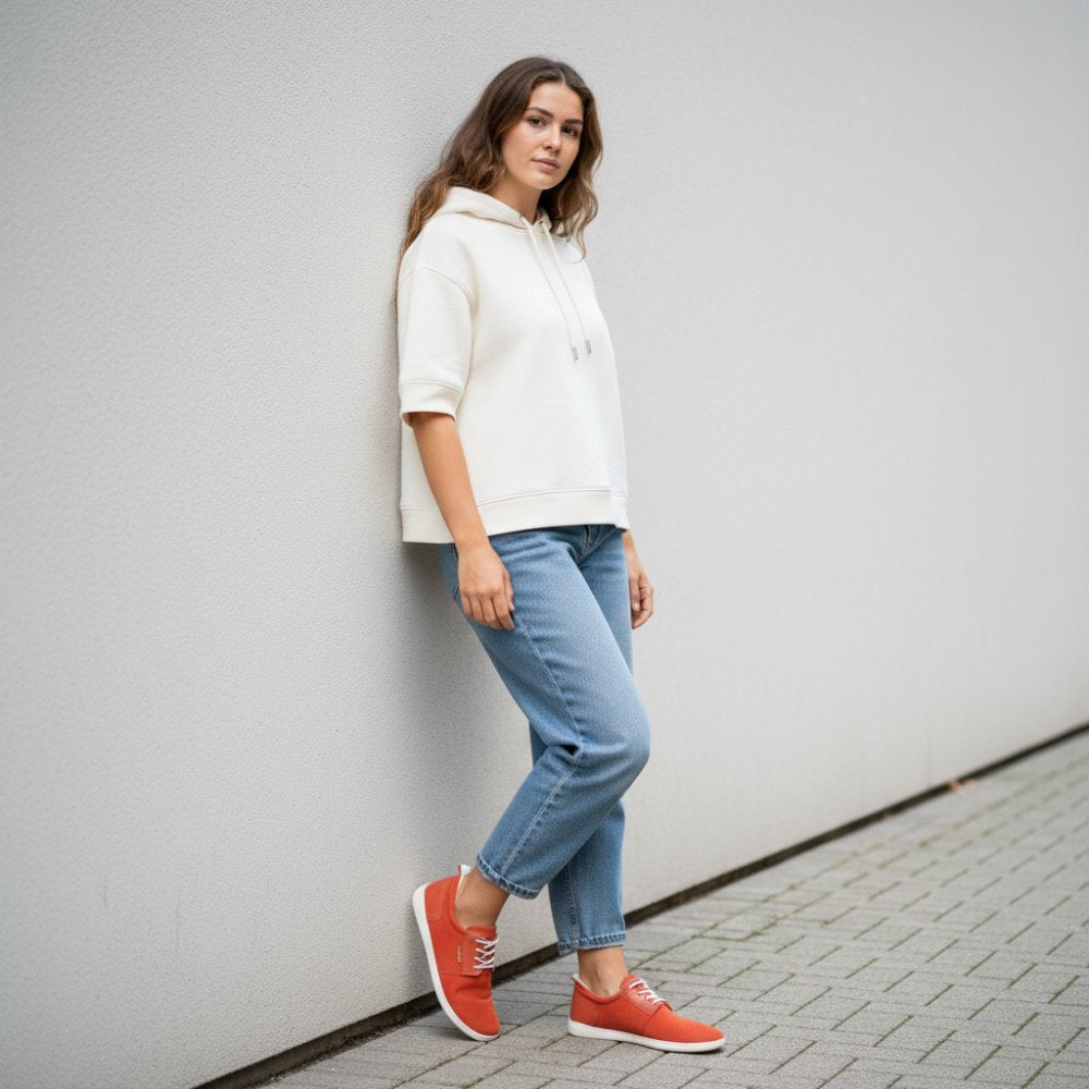 Alles an dem Barfußschuh besteht aus hochwertigen Materialien und ist selbstverständlich handvernäht. Die dünne und hochflexible Sohle bietet mit der weißen Farbe einen schönen Kontrast zum auffälligen Orangeton. Der Barfußschuh sieht frisch und modern aus und peppt jedes Outfit auf. Zur Jeans sieht er einfach unwiderstehlich aus und zieht die Blicke ganz von allein auf sich. PIQUANTer als in der Ausführung Opal geht es nicht!
