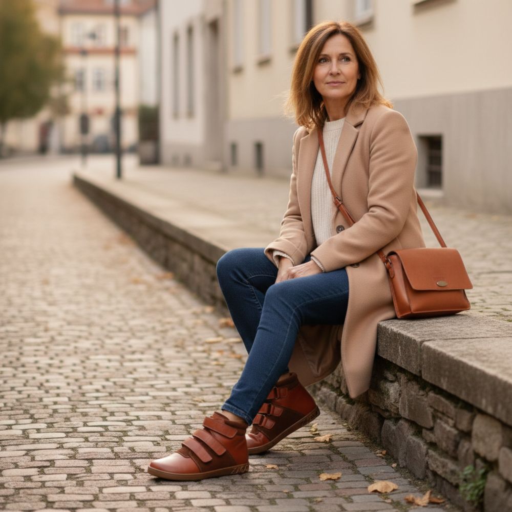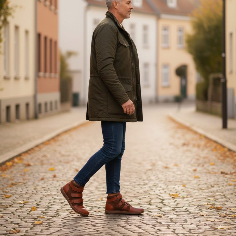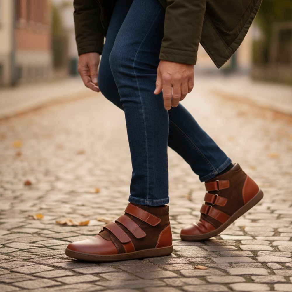 QOOPER ist der halbhohe Barfußschuh, der durch sein braunes Leder besonders nobel aussieht und mit dem praktischen Klettverschluss einfach wahnsinnig komfortabel ist.