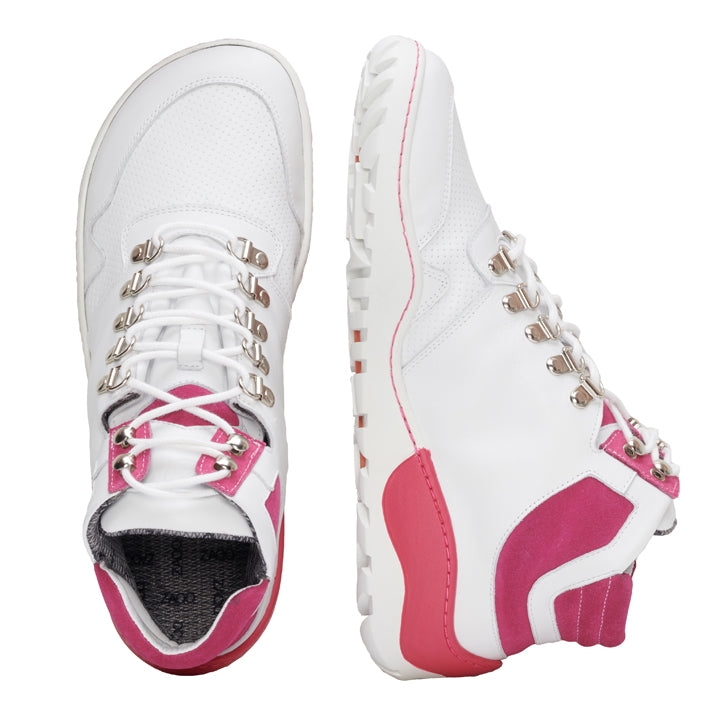 Für diesen Barfußschuh verwenden wir weißes Nappaleder, welches im vorderen Bereich eine perforierte Struktur aufweist. Die pinken Einsätze geben unserem VAQATION die sportlich-feminine Ausstrahlung. Von innen überzeugt der Outdoorschuh mit unserer besonders atmungsaktiven und wasserdichten ZAQQ Membran. Somit kannst Du Deinen neuen VAQATION auch bei Regen problemlos tragen.